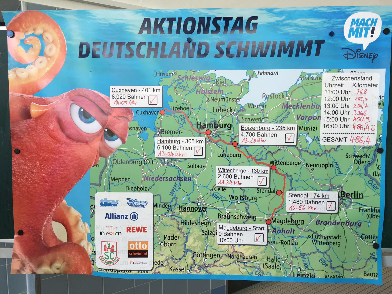 Auch die Magdeburger Bevölkerung leistete Ihren Beitrag. Mit tatkräftiger Unterstützung des SCM-Leistungszentrum kamen insgesammt 486,4 km zustande. Ein beachtliches Ergebnis für 6 Stunden Dauerschwimmen (81 km/h !). Als symbolisches Ziel wurde vorher die 300 km Strecke Magdeburg-Hamburg ausgerufen. Dies wurde jedoch bereits nach nur 3 Stunden erreicht, sodass man Cuxhaven als neues Ziel ausgerufen hat. Aber auch diese Strecke wurde nur zum Zwischenziel. Am Ende haben die schwimmbegeisterten Magdeburger eine Entfernung von Magdeburg bis nach Helgoland zurückgelegt !